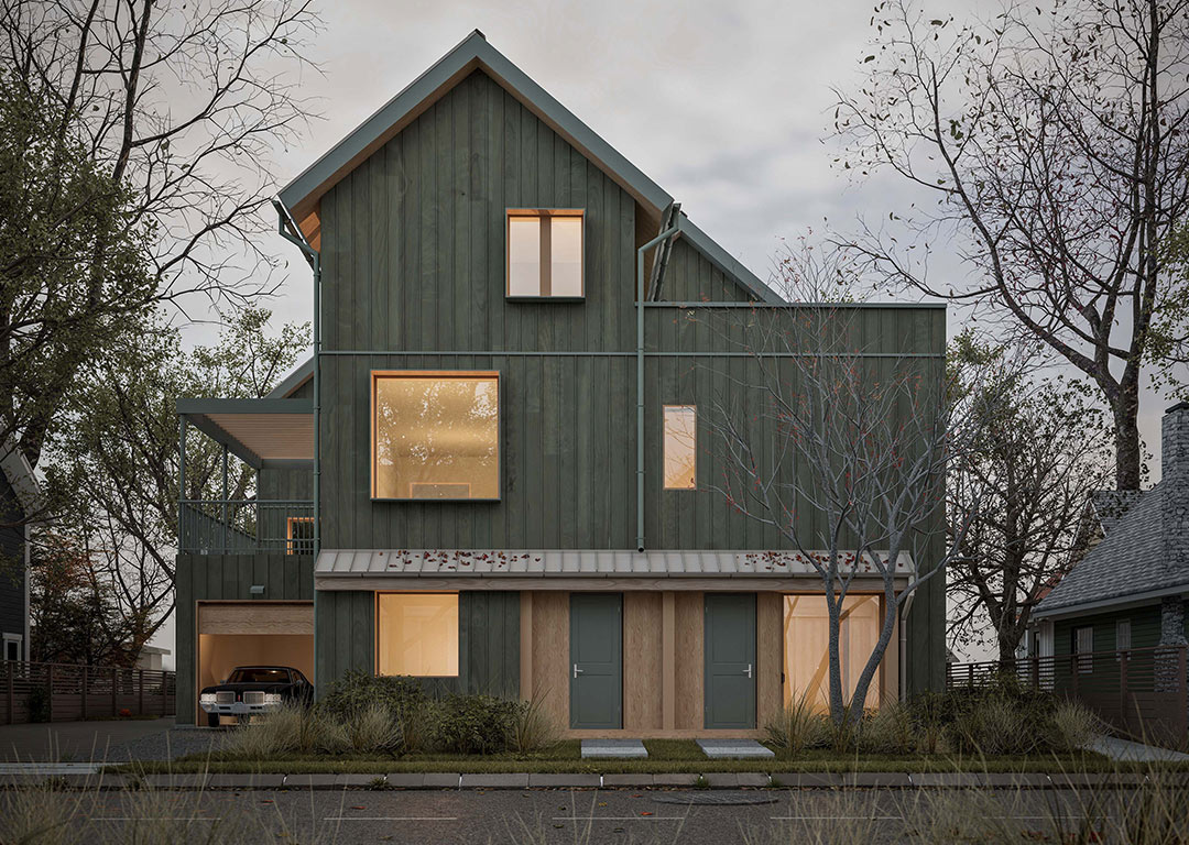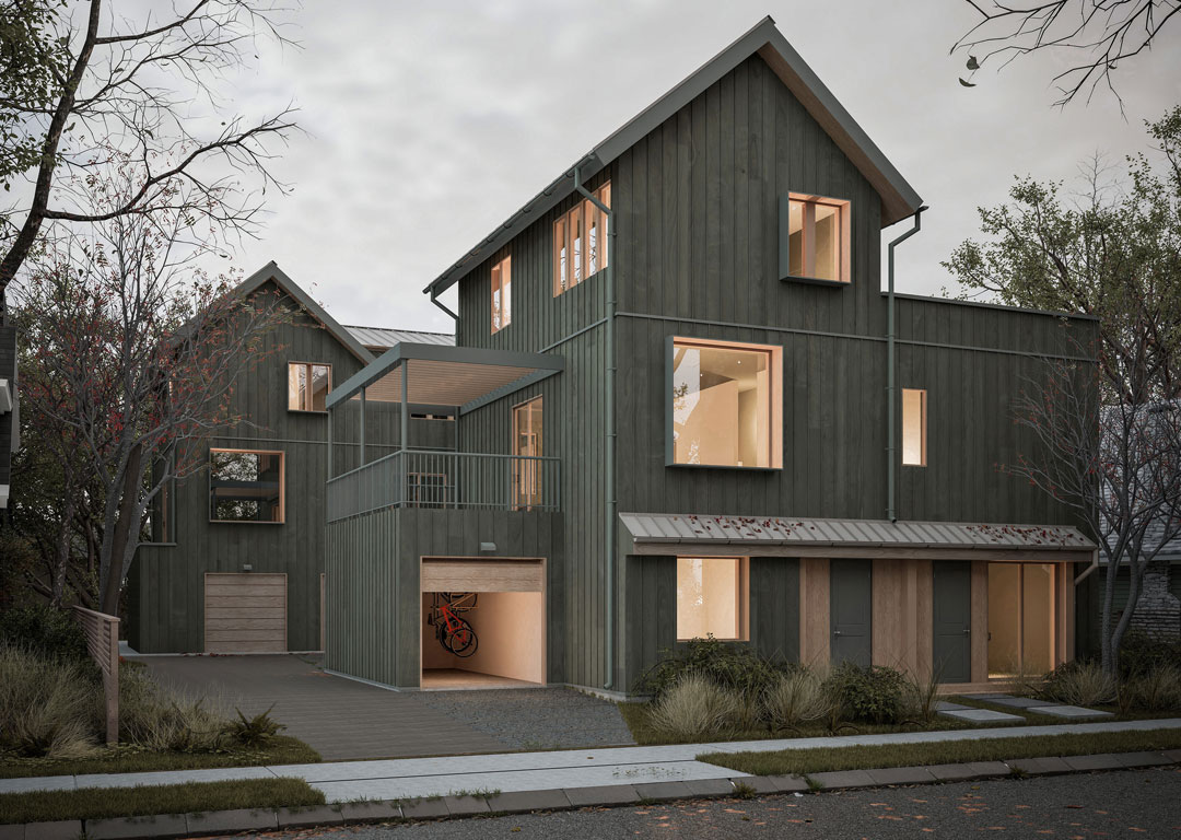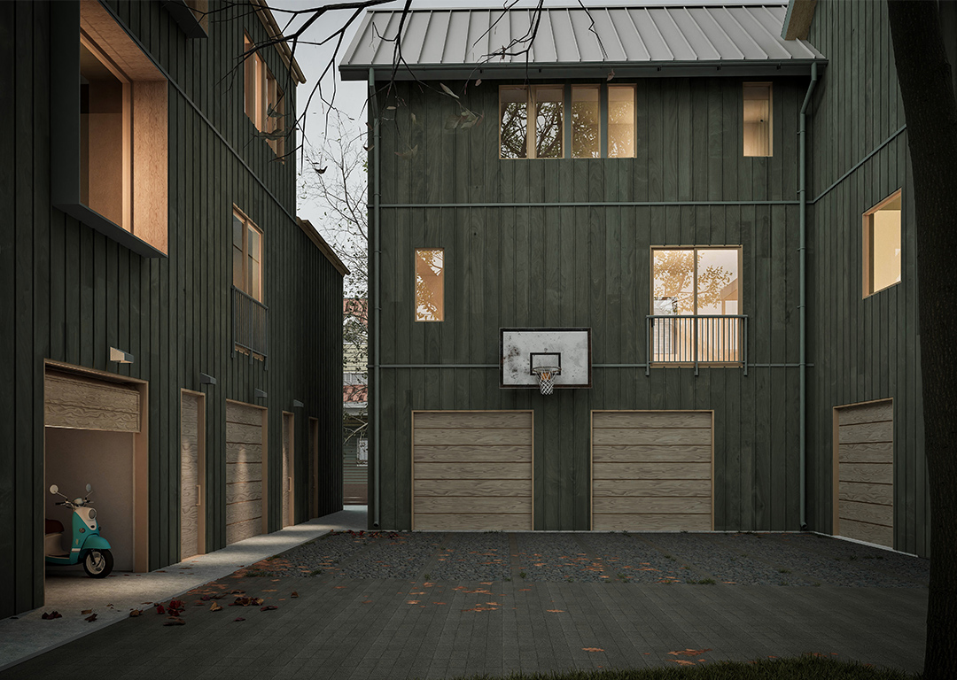 The design emphasizes efficient urban living, with features such as private rooftop decks, secure bicycle storage, and heated crawlspaces. Homes are accessed from the lane, helping maintain a pedestrian-friendly streetscape while maximizing site efficiency.