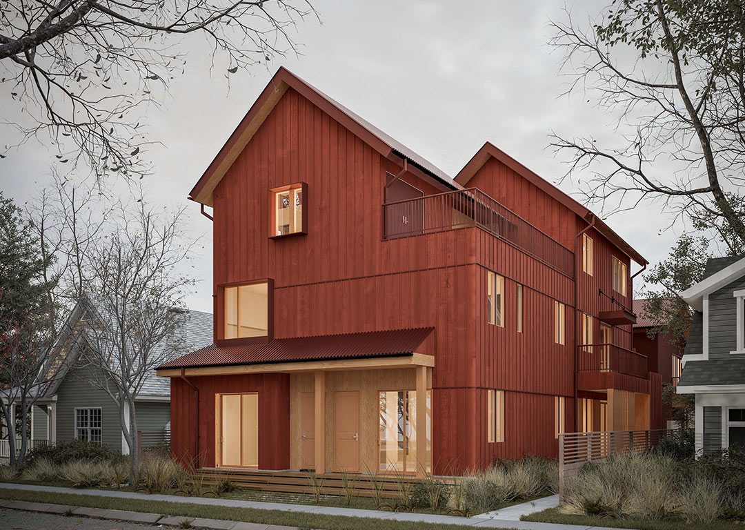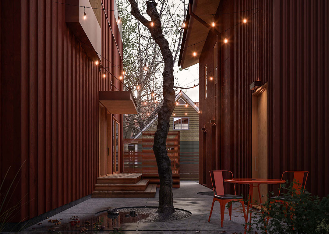The SNDBOX 3+3 model is designed as a compact six-unit infill development arranged across two buildings and centered around a shared courtyard.